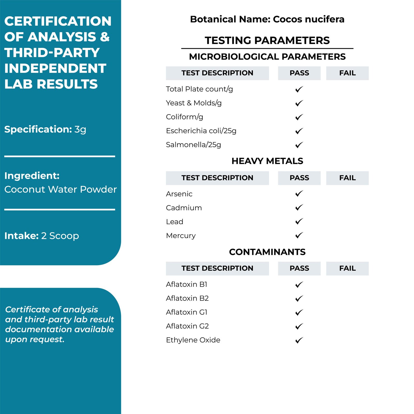Every batch of this product is tested by independent third-party labs. For example, the testing covers microbiological safety such as E. coli, Salmonella, yeast, and molds. Heavy metals including arsenic, cadmium, lead, and mercury are also checked. Furthermore, contaminants like aflatoxins and ethylene oxide undergo testing. Therefore, you can trust that every scoop of Coconut Water Powder is safe and reliable.