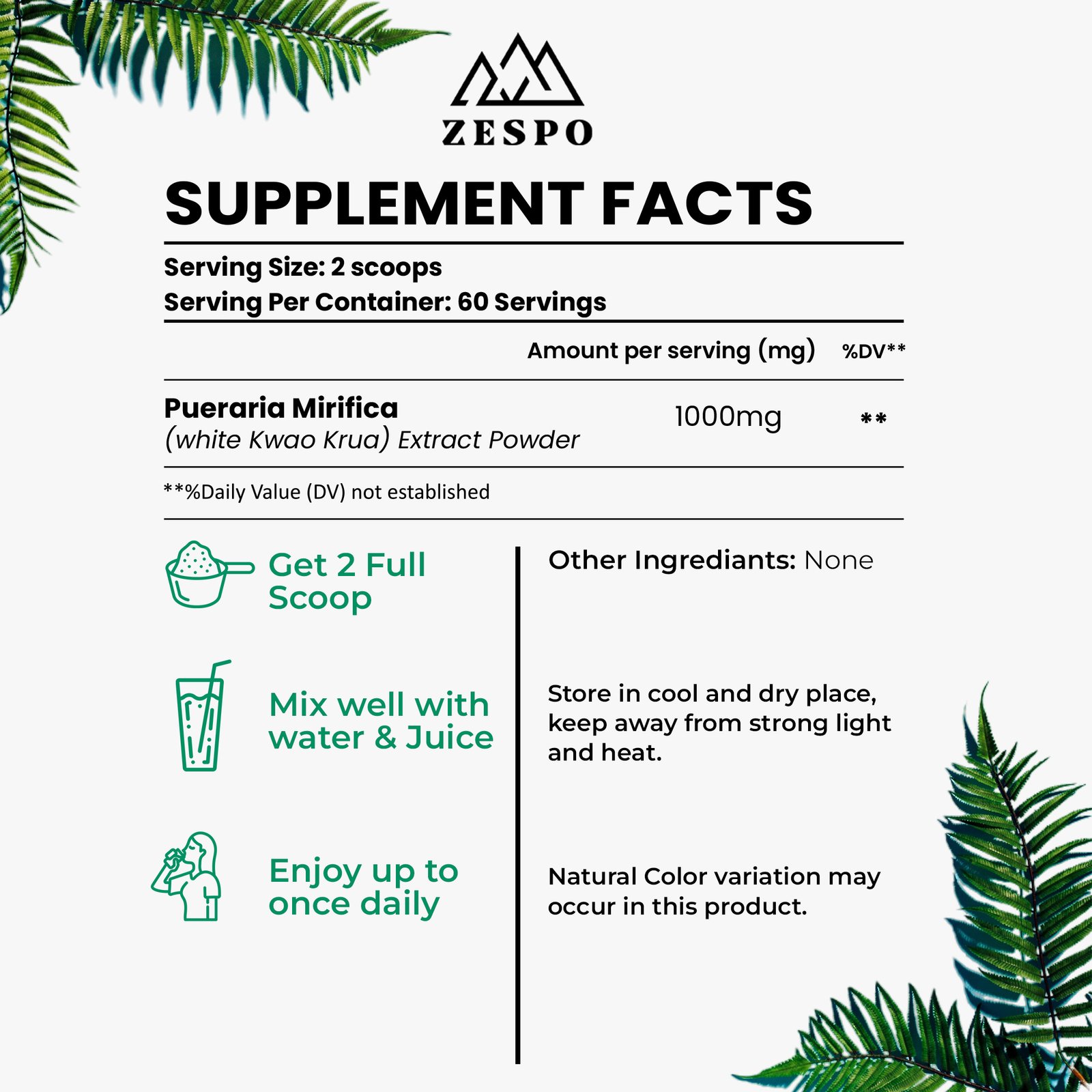 Zespo Pueraria Mirifica Powder contains only the pure extract. We do not add fillers, preservatives, or artificial ingredients. Instead, we focus on authenticity and simplicity. The supplement remains Non-GMO, Vegan, and Lab Tested, which builds confidence in its safety and transparency. For example, many customers choose it because they want supplements that stay close to nature.