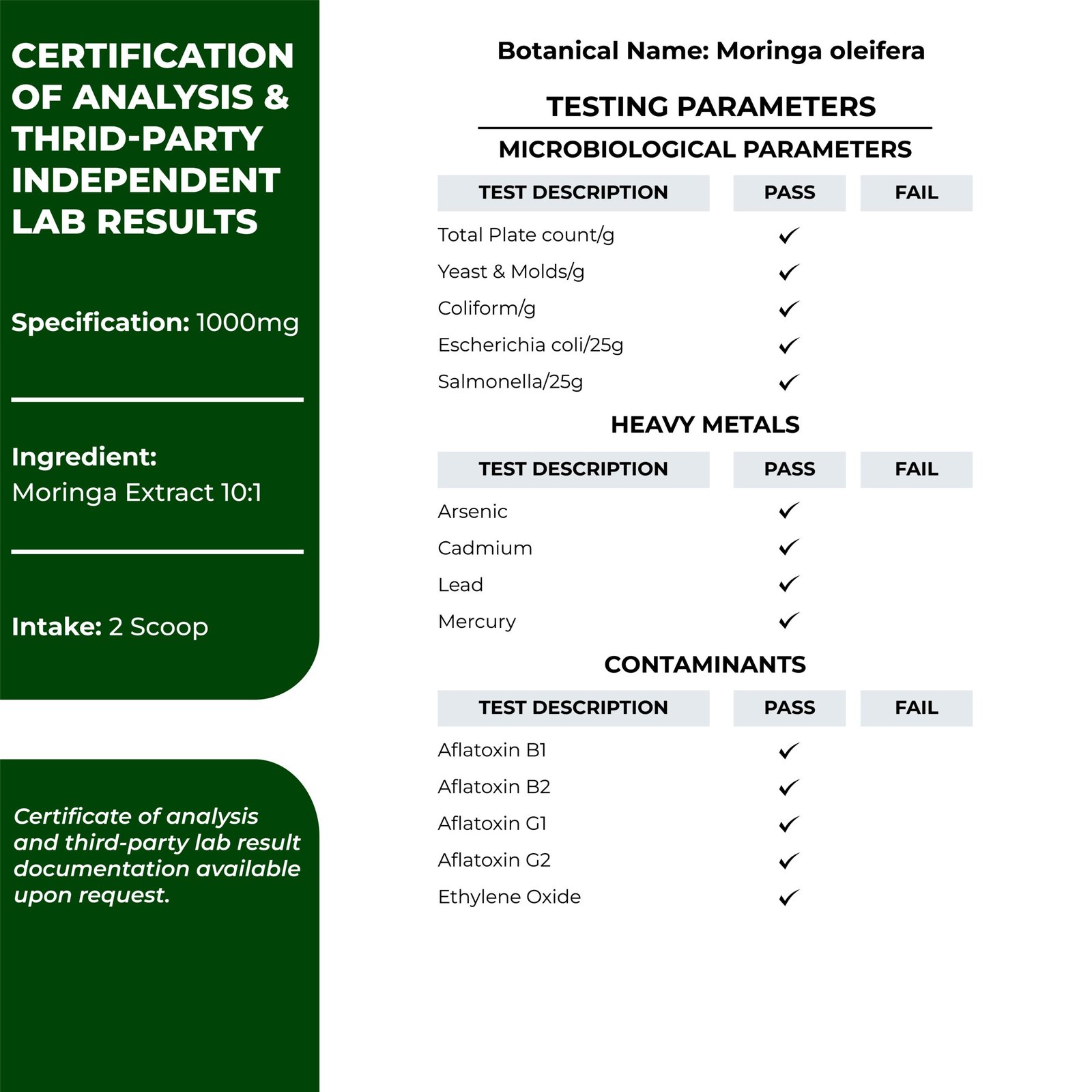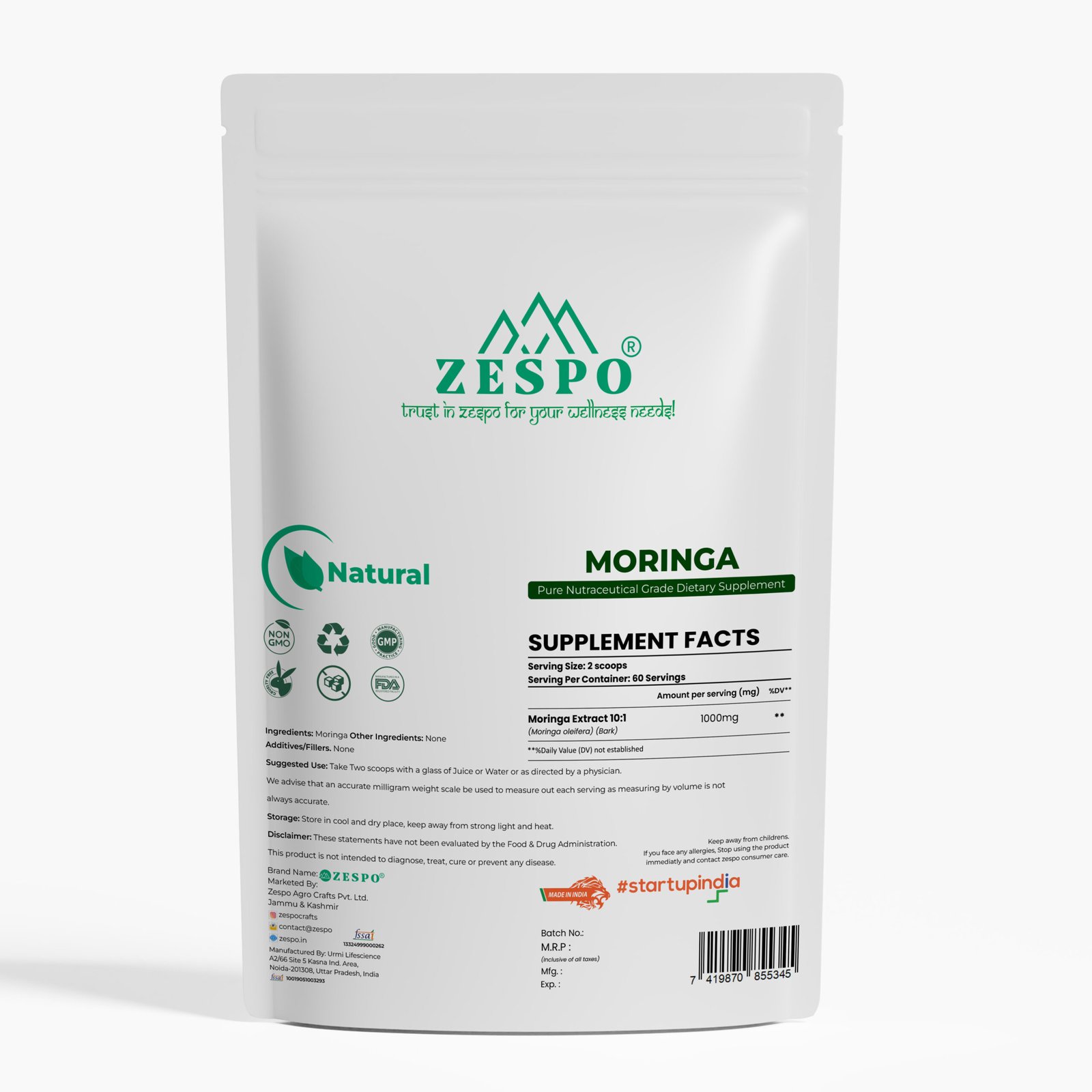 Zespo creates Moringa Powder without fillers, additives, or preservatives. Instead, we keep the formula simple, Vegan, Non-GMO, and Lab Tested. For example, customers who prefer natural supplements often choose this powder for its authenticity. The packaging clearly displays supplement facts and serving size, so you always know what you are adding to your routine.